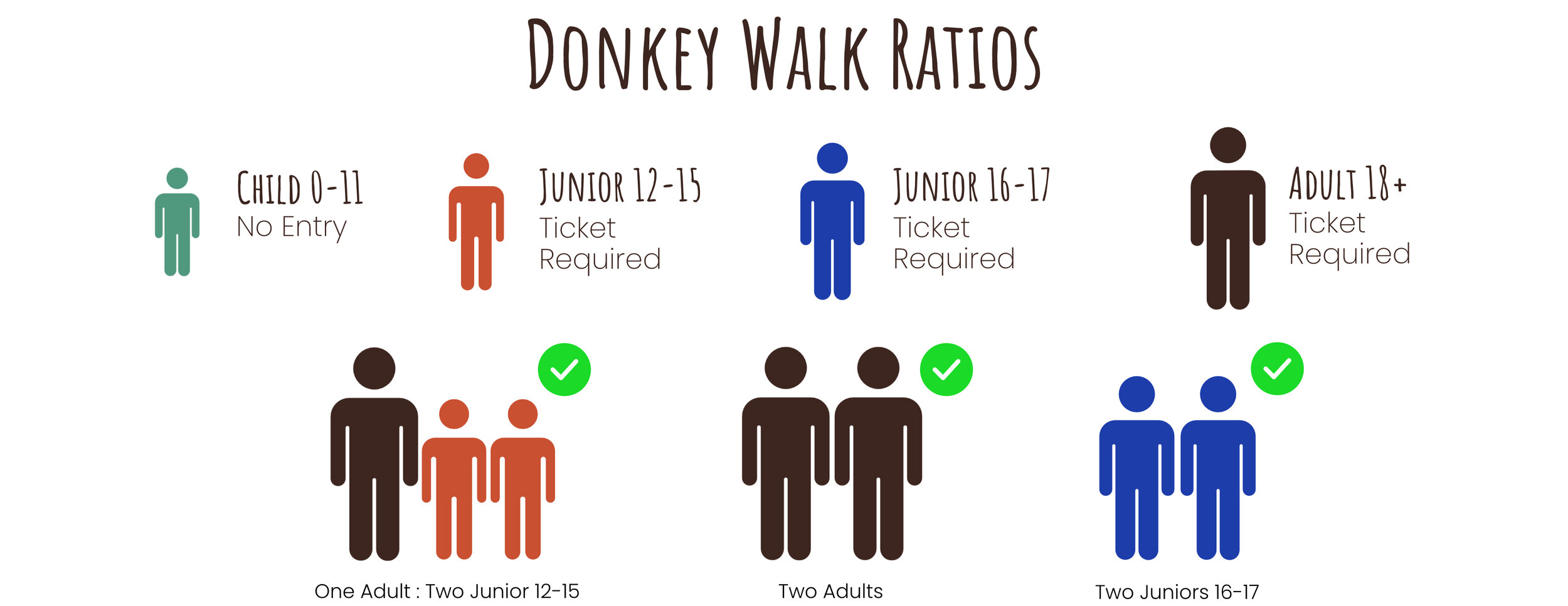 All participants must be aged 12 or over, and we operate a one person, one donkey system. This is very important to ensure the safety of our animals. We take animal welfare incredibly seriously, and all of our donkeys are fully licenced by both qualified vets and the local council to be safe and healthy before taking part in any of our experiences.