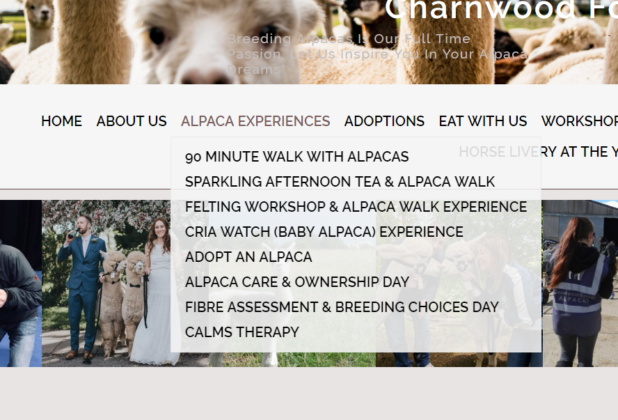 Select Alpaca Experiences from the navigation bar at the top of the page - this will produce a drop down menu